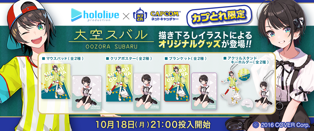 「#大空スバル」とカプコンのオンラインクレーン「#カプとれ」とのコラボグッズが、10月18日(月)21時から投入開始🥳🙌