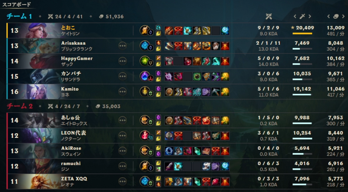 2/7本番の「LoL The k4sen」全スクリムの個人戦績です
