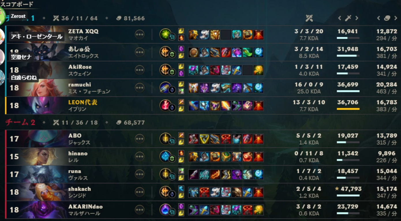 2/7本番の「LoL The k4sen」全スクリムの個人戦績です