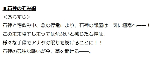 何故かあらすじが修正されて極寒になるのがアナタの部屋から石神の部屋に変更されている