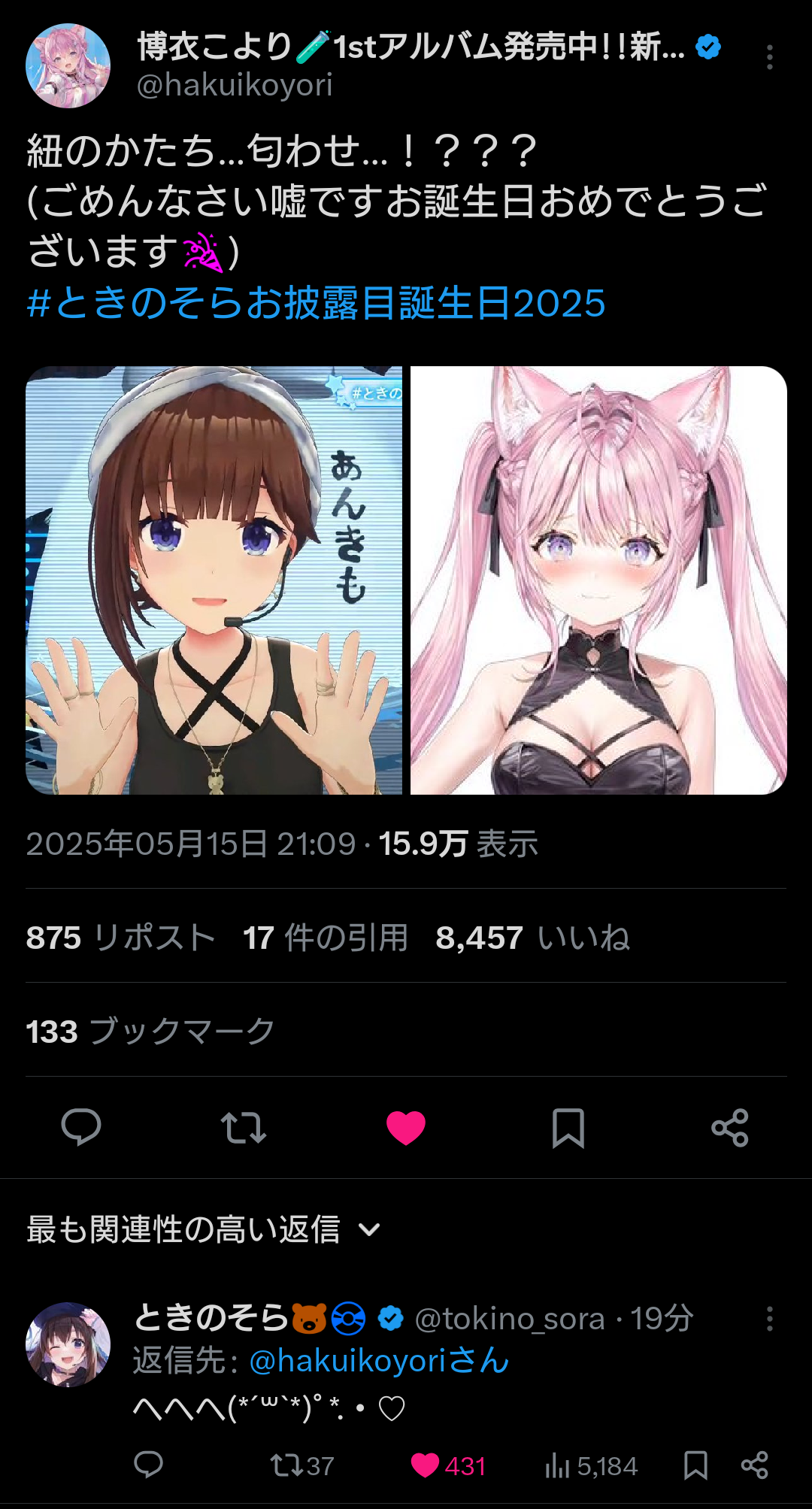 — 博衣こより🧪1stアルバム発売中!!新曲MVも見てね🎉 (@hakuikoyori) May 15, 2025