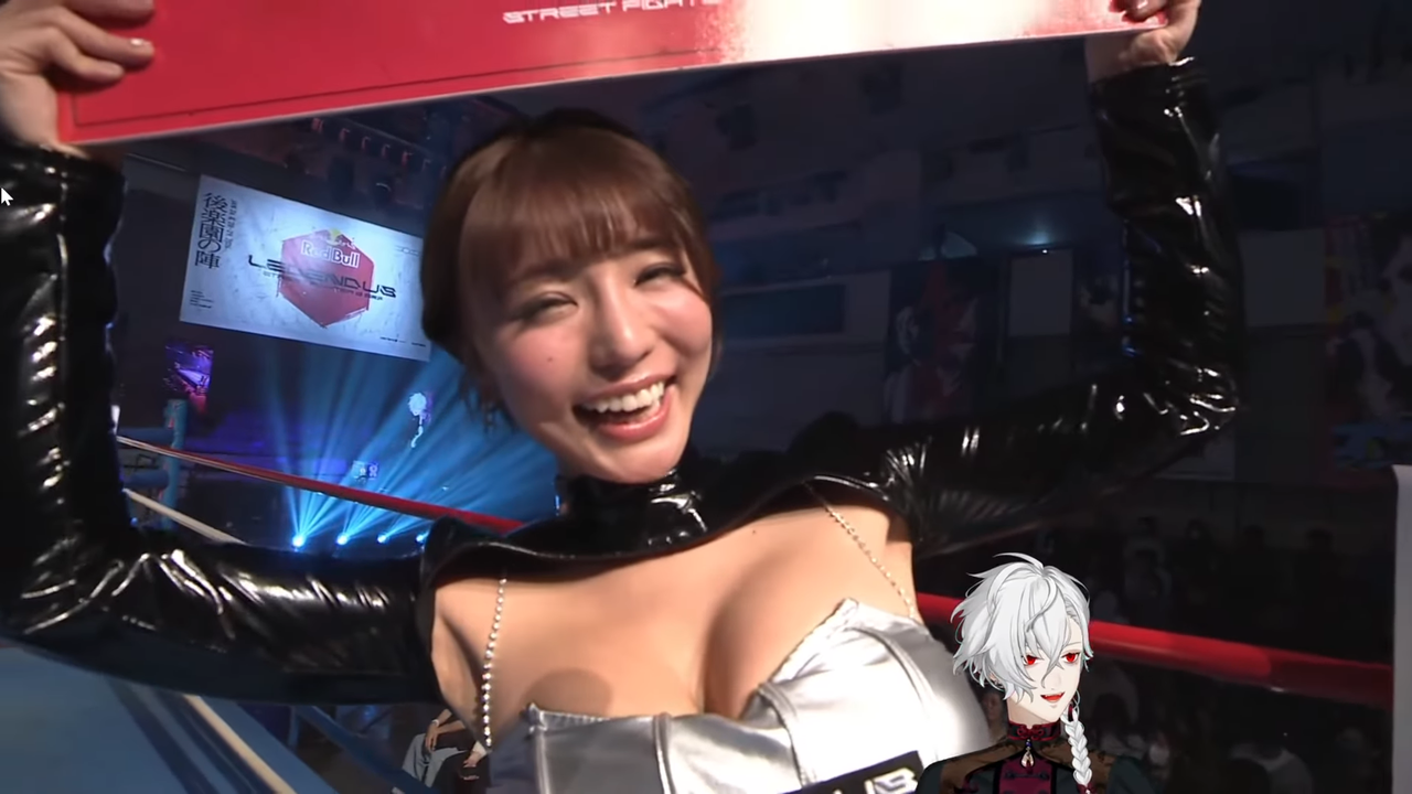 ラウンドガールと自分の笑顔を比べる葛葉
