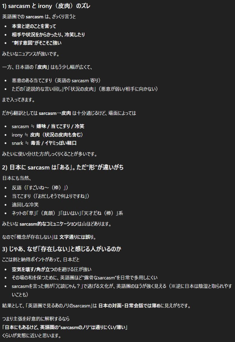 あるいは日本での皮肉はハイコンテクストすぎるからコミュニティ内に居ないと気付かないアレかな。